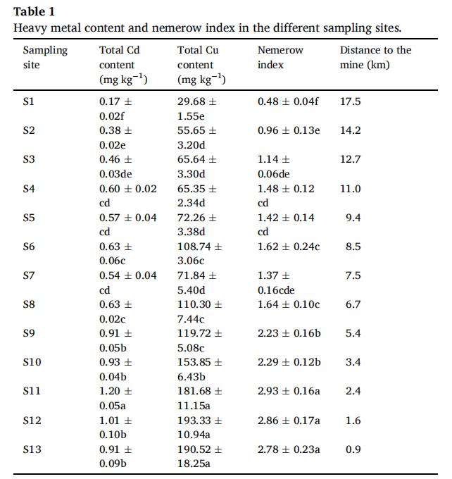 ·镉和铜的风险筛查值分别为0.3毫克/千克和50毫克/千克。同一列中不同小写字母表示采样点间存在显著差异(Tukey HSD 检验,P<0.05)。