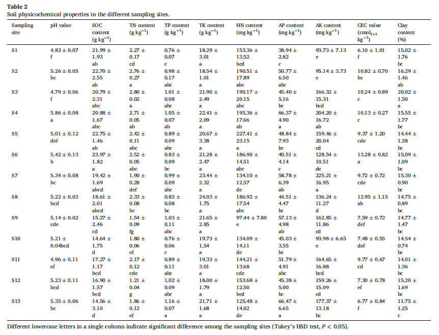 ·表格2显示,重金属污染与土壤有机碳含量及氮素有效性存在显著的负相关关系。