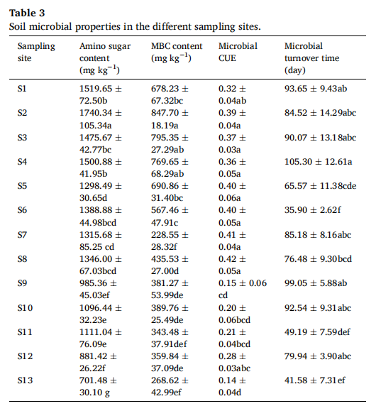 ·表格3显示,重金属污染显著抑制了微生物的合成代谢功能,表现为微生物生物量、微生物残留物积累以及碳利用效率的全面下降。