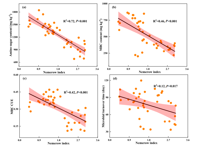 图2. 内梅罗指数与微生物变量的关系:(a) 氨基糖含量,(b) MBC含量,(c) 微生物CUE,(d) 微生物更替时间。