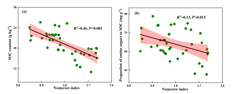 图3. 内梅罗指数与(a)土壤有机碳(SOC)含量及(b)SOC中氨基糖比例的关系。