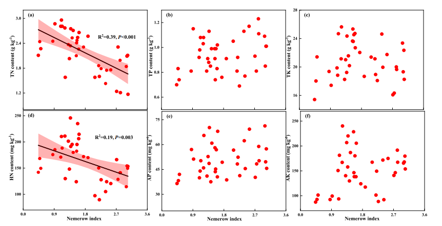 图4显示只有总氮(TN)和水解氮(HN)与内梅罗指数呈显著负相关,表明重金属污染导致土壤氮素有效性降低,这进一步影响了微生物的生理功能。