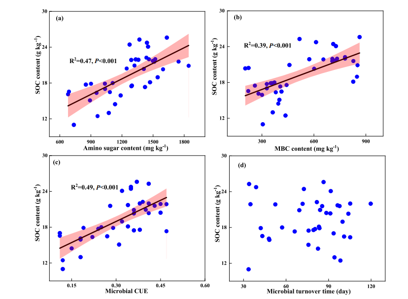 图6. 微生物变量与SOC含量的关系:(a) 氨基糖含量,(b) MBC含量,(c) 微生物CUE,(d) 微生物周转时间。
