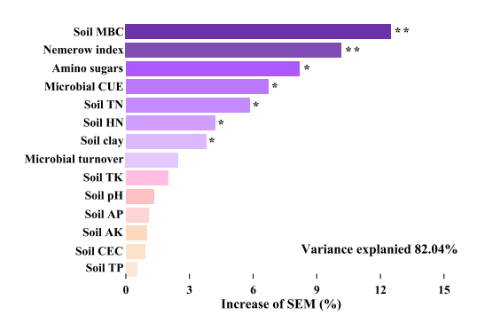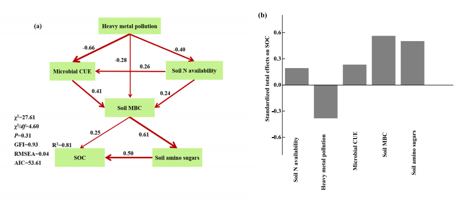 图9. (a) 结构方程模型(SEM)展示了重金属污染、微生物特性及土壤氮有效性对土壤有机碳(SOC)变异的影响。